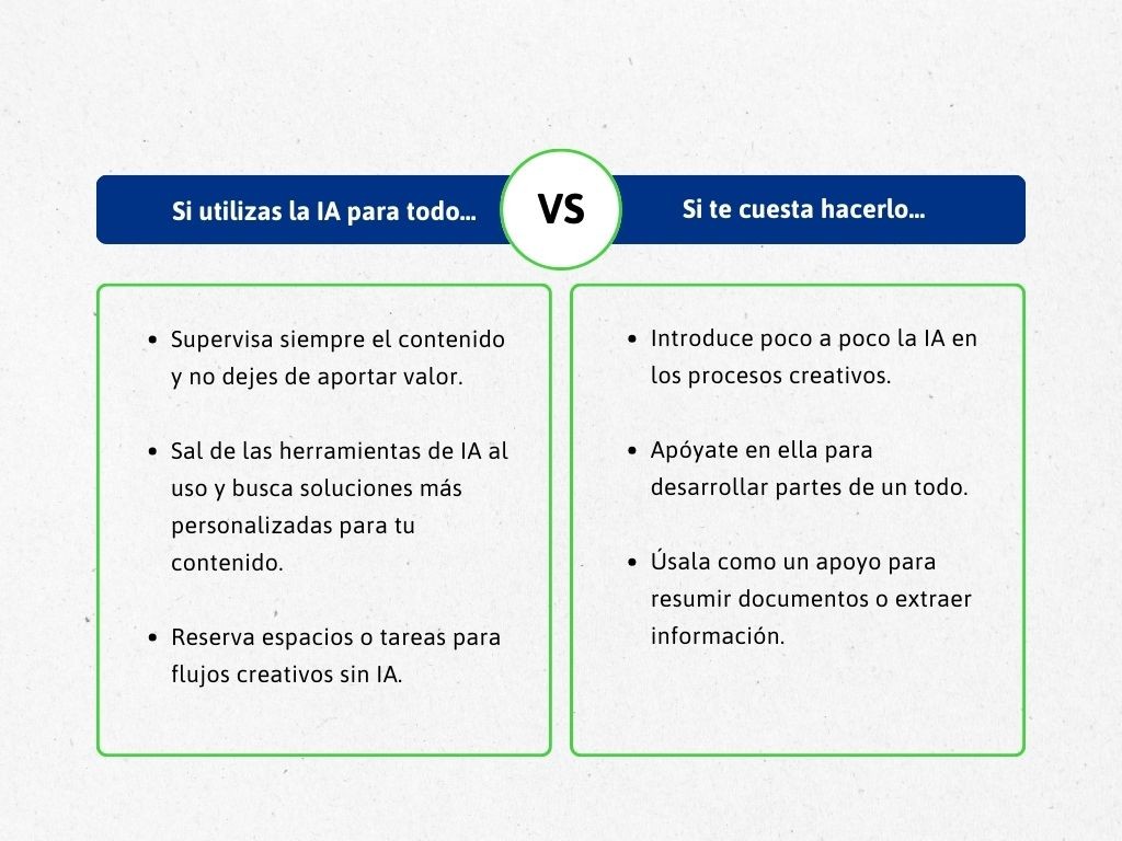 Volvamos a nuestro dilema original. Si con la IA podemos asegurarnos regularidad y ritmo (cantidad), la calidad está en manos de los equipos, de cómo enfoquemos los contenidos, los supervisemos y los hagamos únicos.