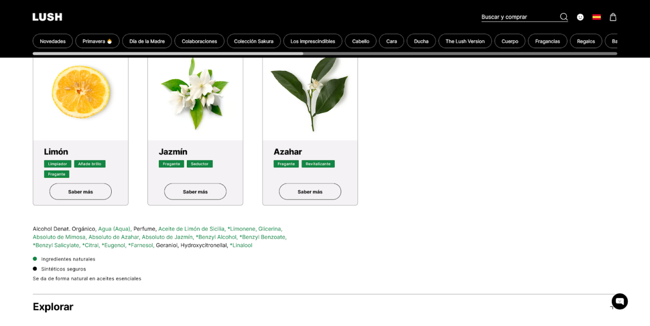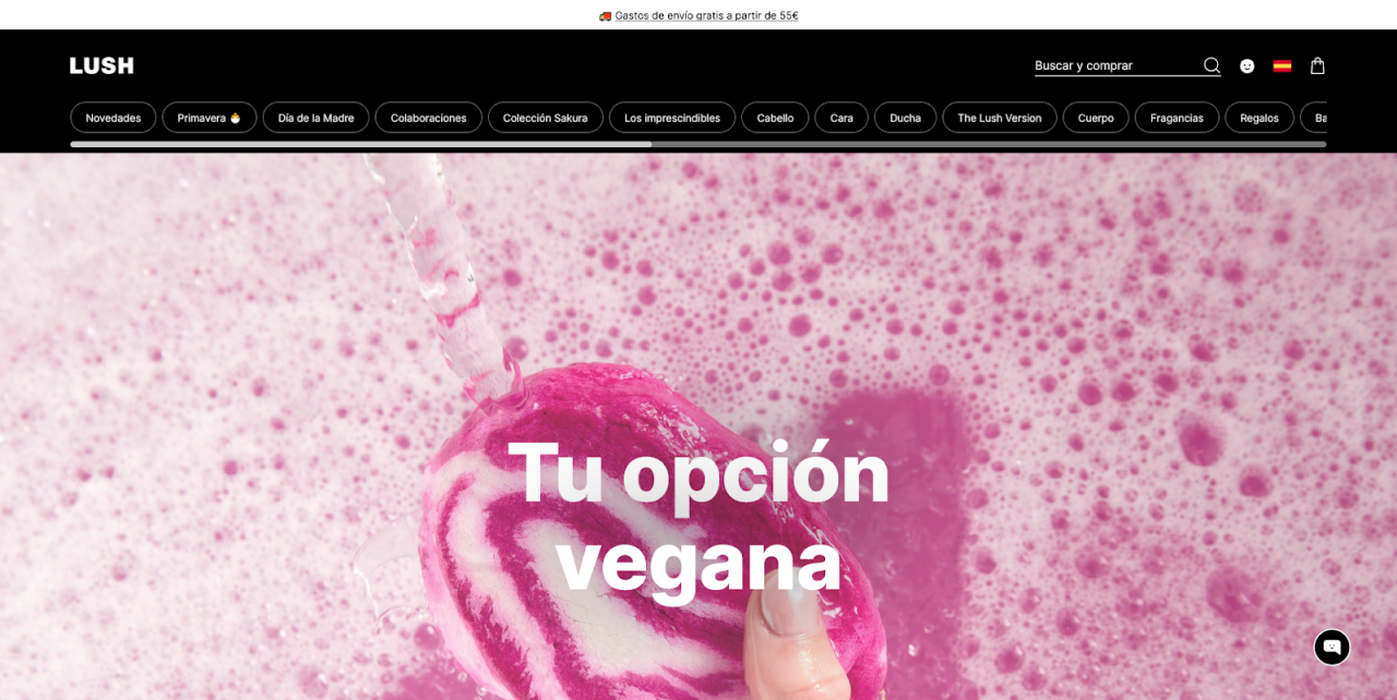 Ejemplo: la marca de cosmética vegana Lush deja claro en su web a partir de cuánto son los pedidos con gastos de envío gratis, también refleja algo importante para su tipo de público: qué ingredientes llevan sus cosméticos y cuáles son sintéticos y naturales.