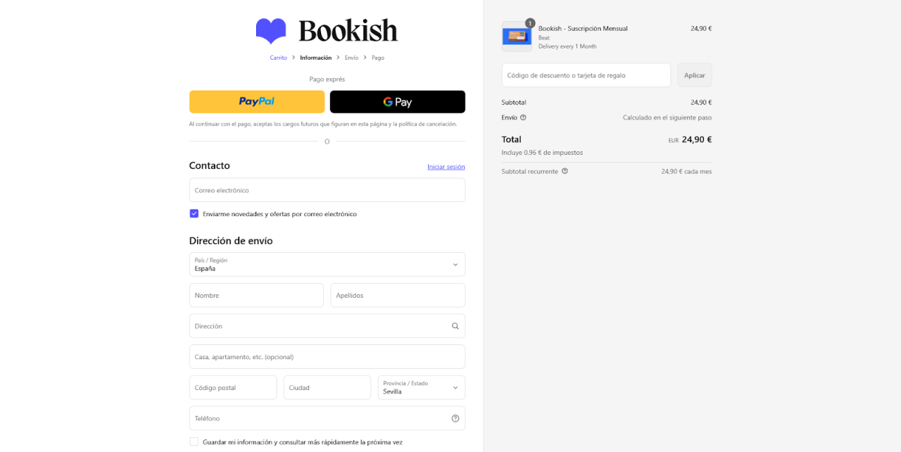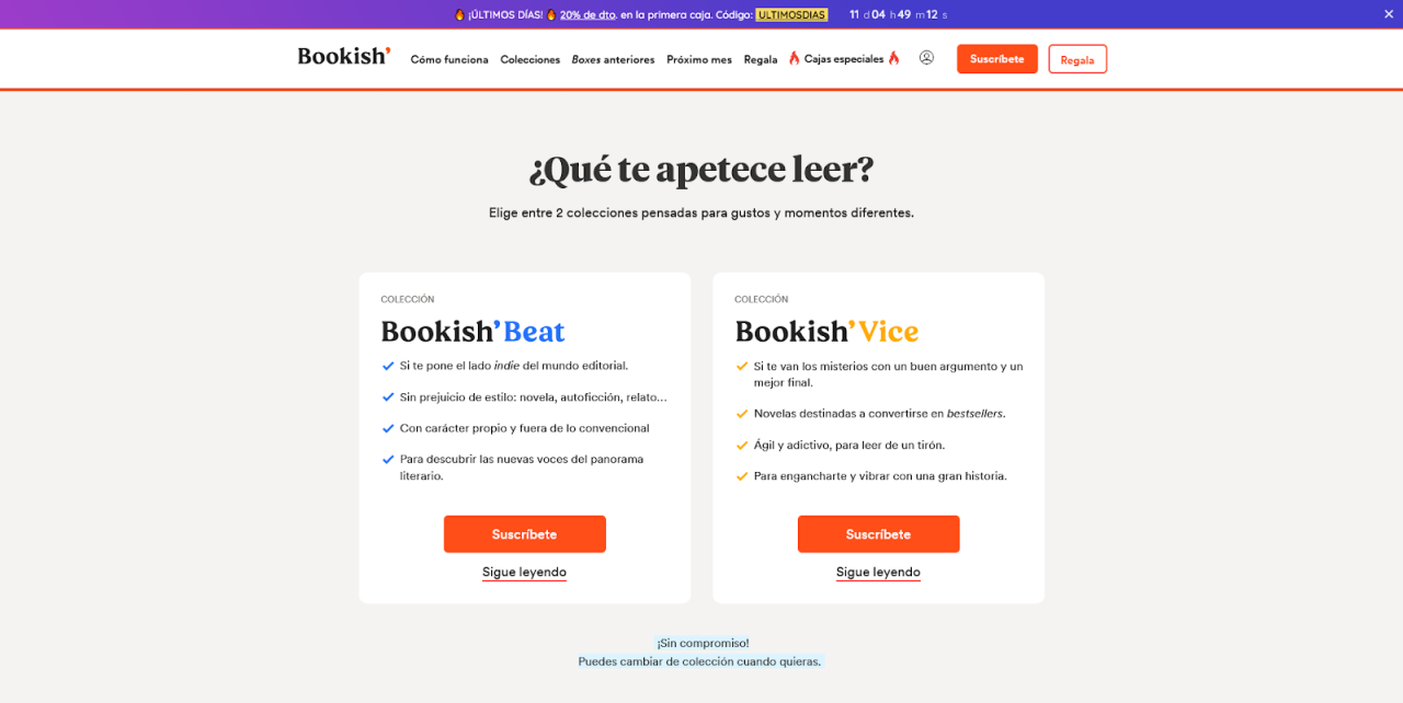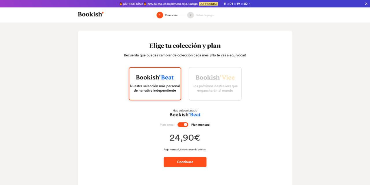 Ejemplo: la marca Bookish de suscripción literaria permite finalizar la suscripción mensual de una de sus dos colecciones en pocos pasos, con los datos estrictamente esenciales.