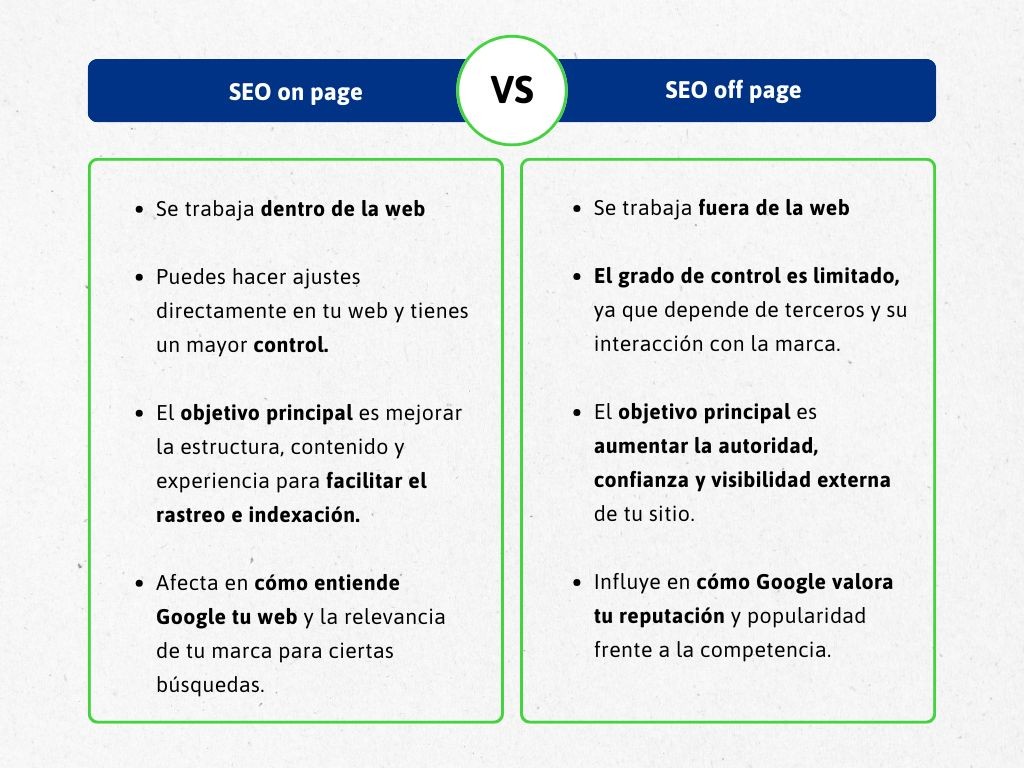 De forma simple, la principal diferencia entre ambos radica en que el SEO on page se centra en optimizar elementos internos de la propia web, mientras que el SEO off page se enfoca en trabajar en acciones fuera de la página.