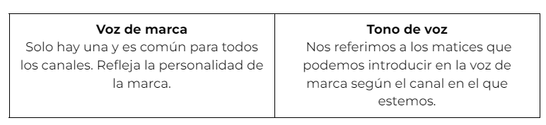 - Determina el tono de voz. ¿Cuál es la personalidad y la voz de tu marca? Si aún no lo sabes, primero debes tener esto claro antes de establecer el tono de voz. Una pregunta habitual es qué diferencia hay entre la voz de marca y el tono de voz.