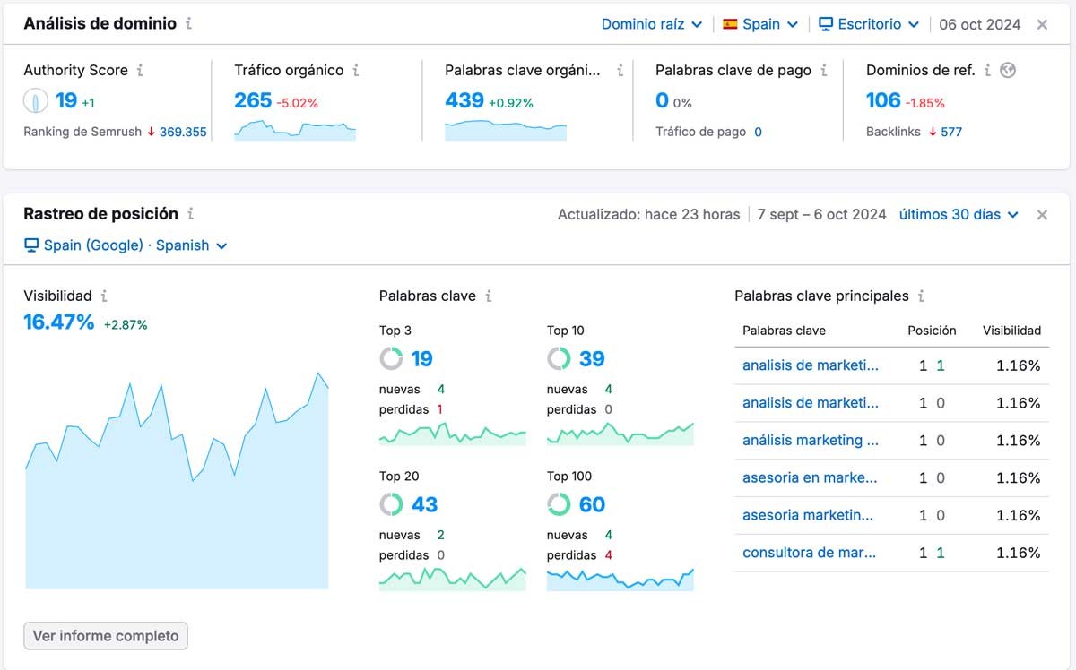 Algunas herramientas ofrecen información sobre el rendimiento de la competencia. Esto es muy útil para llevar un seguimiento de la evolución de su estrategia porque nos permite identificar fortalezas y debilidades comparativas de forma periódica. Con estos datos, es posible ver si necesitamos ajustes en nuestra estrategia para superar a los competidores en determinadas áreas.