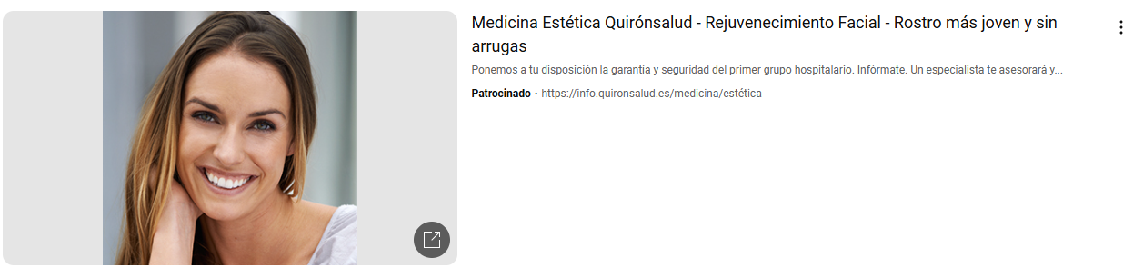 - Apuesta por las campañas de Google Discover. Se trata de anuncios muy visuales que suelen llamar la atención del usuario. Se integran de forma natural en la navegación, por lo que puede resultar menos invasivo que otro tipo de publicidad online, como los banners. Los anuncios Discovery aparecen en el feed de Google, la página principal de YouTube y la pestaña de «Promociones» en Gmail e impactan en personas que tienen interés en el sector de la estética, belleza o bienestar. Imagina que has hecho una búsqueda en Google y has leído varios artículos sobre rejuvenecimiento facial. Es probable que en otra navegación, al abrir YouTube, por ejemplo, te aparezcan vídeos promocionados de clínicas estéticas con información relevante sobre bótox o ácido hialurónico. Por eso, podría decirse que es un tipo de campaña de remarketing, pero automatizada.