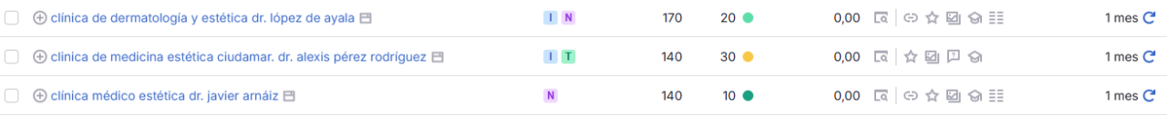 - Si en tu equipo hay un doctor o doctora reconocido que atrae pacientes por su reputación, considera realizar una web propia, aparte de la clínica. Hay pacientes que buscan a ese profesional en concreto y no tanto la clínica en general. Tener una web personal permite destacar su trayectoria, especialidades y casos de éxito, además de generar más confianza con testimonios y apariciones en medios. Ambas webs pueden complementarse y dirigir tráfico entre sí según lo que busque el usuario. Mira como en Semrush aparecen búsquedas de clínicas estéticas acompañadas de nombres de doctores o doctoras: