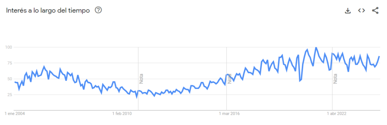 Mira la evolución de la palabra clave «comprar piso» desde el año 2004. ¿Ves el pico de búsquedas entre los años 2021 y 2022?