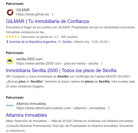 - Publicidad en Google Ads. ¿Te has planteado hacer algún tipo de campaña en Google Ads? Aunque se trata de un nicho competido (lo puedes comprobar solo con hacer una búsqueda en Google del tipo comprar piso en X ciudad), puede ayudarte a captar tráfico cualificado. Si no tienes conocimientos suficientes, un consultor de paid media es la mejor opción si quieres rentabilizar tu inversión.