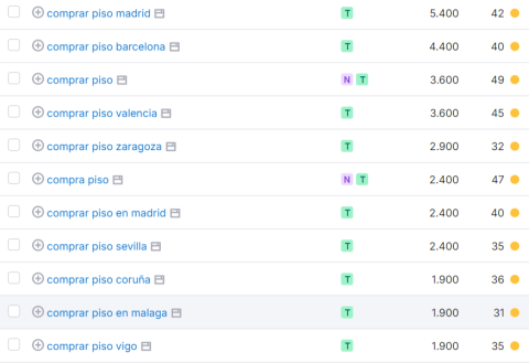 - SEO local. Esencial trabajarlo en tu marketing para inmobiliarias. Los usuarios buscan comprar o vender sus propiedades en una zona geográfica concreta y tu página tiene que estar posicionada en los lugares donde operes. ¿Y si cuentas con un consultor de SEO local para trabajar tu estrategia? Si te fijas, casi todas las búsquedas que nos arroja la herramienta Semrush al buscar la palabra clave «comprar piso» pertenecen a búsquedas locales: