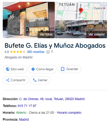 - Trabaja el SEO Local. Aunque el asesoramiento online cada vez está más extendido, aún es muy frecuente que las personas que busquen un abogado lo hagan cerca de la zona en la que residen. Recuerda que muchos temas son complicados de entender para quiénes tienen pocos conocimientos jurídicos y prefieren acudir de forma física al despacho para que puedan asesorarle. Completa la ficha de Google My Business lo máximo posible y cuídala. Muchas marcas lo hacen y se olvidan de ella, pero te recomendamos que la alimentes de contenido. Por ejemplo, añade fotos recientes de tu oficina o agrega las nuevas entradas de blog en el apartado de «Novedades».