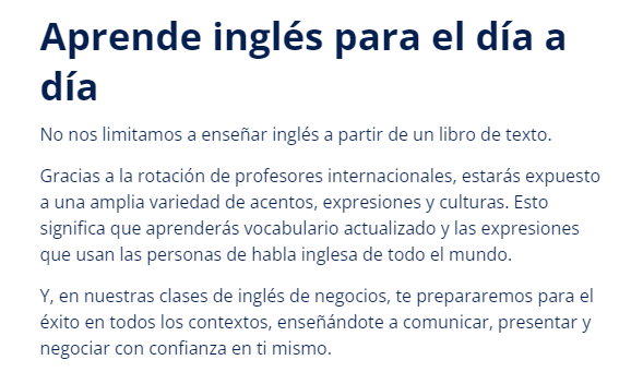 Como academia de idiomas resuelves los puntos de dolor de tus clientes relacionados con una nueva lengua. Por ejemplo, sortear la barrera de nivel que requieren algunos puestos laborales.