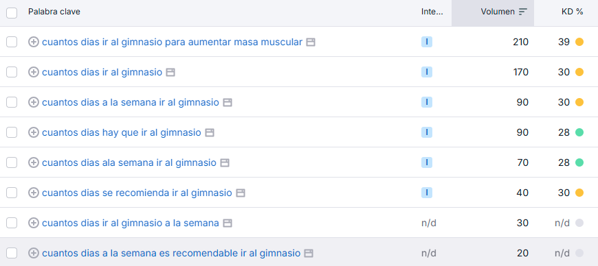 Si usas alguna herramienta para buscar palabras clave, como Semrush, verás que, al poner la palabra gimnasio, aparecen muchas keywords del tipo: gimnasio/gym + ubicación. Por este motivo, si quieres atraer clientes de tu zona, resulta esencial que le des caña a palabras clave por ubicación.