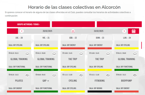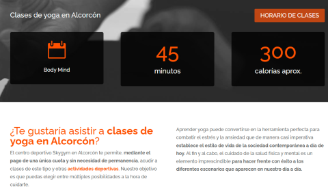 SkyGym se sitúa en Alcorcón, Madrid. Tiene un apartado de servicio de clases colectivas, donde presenta toda la oferta al usuario más el horario de clases actualizado. Además, la página de servicio está optimizada para SEO local:
