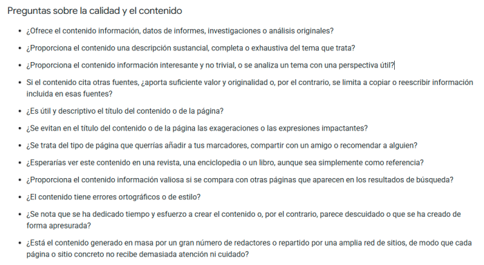 En el documento Directrices básicas de la Búsqueda de Google puedes ver cómo el propio Google recomienda de forma clara crear contenido útil, fiable y centrado en las personas. Puedes autoevaluar tu contenido de forma manual respondiendo a estas preguntas que plantea el buscador para comprobar si tu contenido es de calidad.