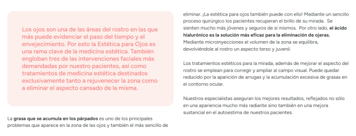 Vamos a ponerte un caso real que podría considerarse thin content desde el punto de vista estratégico de SEO. Tras analizar, de forma general, el marketing digital de las clínicas de estética mejor posicionadas online, nos dimos cuenta de que una de ellas presenta información muy limitada en las páginas de tratamientos y no profundiza en la información.