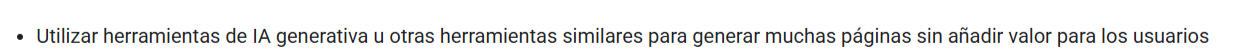 2. Contenidos generados son IA (y sin supervisión). La IA generativa ha facilitado el trabajo de redactores y copywriters. Pero, a menudo, se comete el fallo de crear contenido automático sin revisión humana. Tal y como indica en sus directrices, Google penaliza utilizar herramientas de IA generativa u otras herramientas similares para generar muchas páginas sin añadir valor para los usuarios.